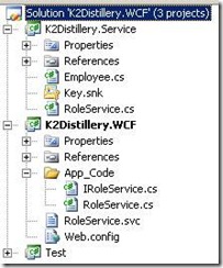Then in K2Distillery.WCF project I will add two files to the App_Code folder called IRoleService.cs and RoleService.cs. I am not going to go into the details of WCF (read the references I have provided) but you need to create an interface that that is decorated with attributes and then implement that interface.